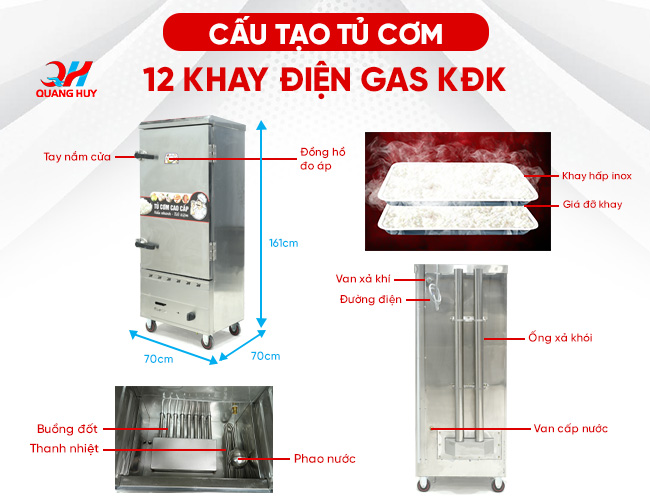 2. Tủ nấu cơm công nghiệp 12 khay với kết cấu tinh tế, tiện lợi
