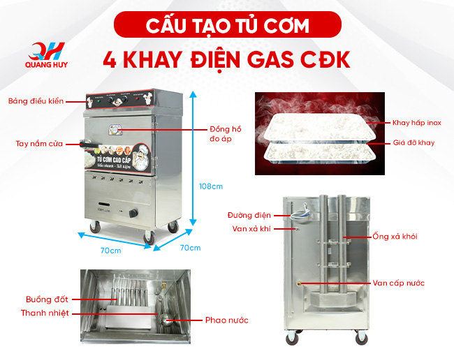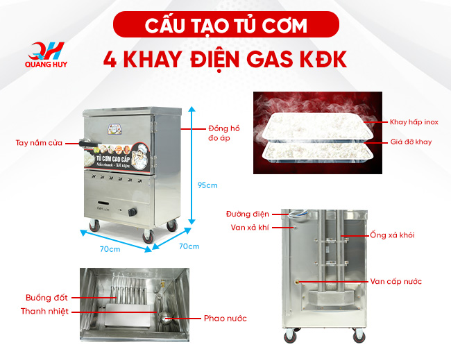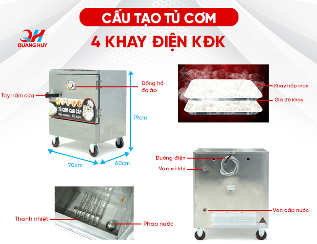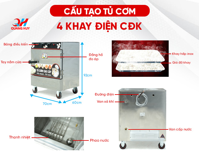 Tủ hấp cơm 4 khay Hồ Chí Minh là mẫu tủ cơm công nghiệp mini được chế tạo để đáp ứng nhu cầu nấu hấp tại các quán cơm bình dân, nhà hàng quy mô nhỏ. Sản phẩm được chế tạo từ vật liệu cao cấp, tích hợp nhiều tính năng thông minh, giúp quá trình làm việc của người dùng vừa an toàn, vừa tiện lợi. Thành phầm cho ra thì khỏi chế bởi hạt cơm không chỉ chín mà còn dẻo thơm, không khô nát.