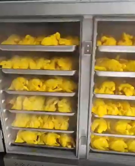 72 - 96 con/mẻ (6-8 con/khay) Hấp gà cần rút bớt 1 nửa số khay/tủ |